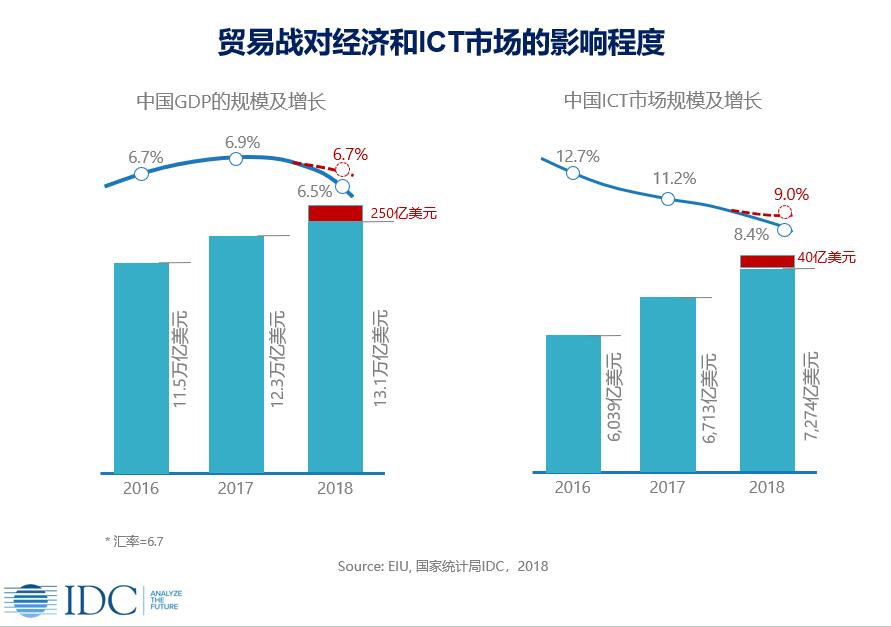 貿(mào)易戰(zhàn)對中美兩國的經(jīng)濟(jì)都將有負(fù)面影響,特別是對貿(mào)易順差巨大的中國。根據(jù)IDC的研究,基于當(dāng)前雙方各340億美元產(chǎn)品開始加征關(guān)稅,中國2018年GDP增長率將減少0.2%(原來的6.7% 到影響后的6.5%),影響的GDP總額約250億美元(1US$=6.7 RMB)。中國2018年總體ICT市場增長率將減少0.6%(原來9.0%到影響后的8.4%),影響的ICT市場規(guī)模約40億美元。