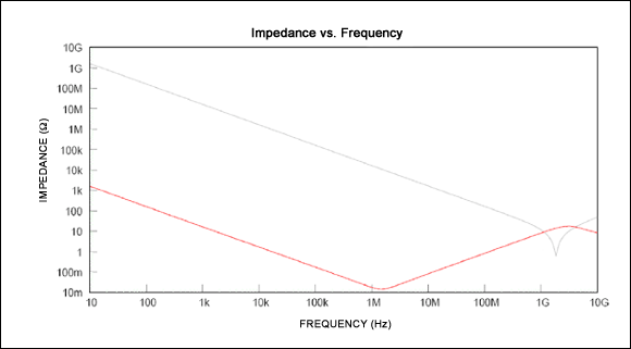 圖1. 放大器的電源線會拾取 RF信號。圖中數(shù)據(jù)表明1µF電容的對地阻抗低于10pF的阻抗,提供更好的噪音抑制能力