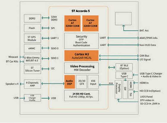 ST的Accordo 5(以下簡稱AC5)汽車處理器可實現(xiàn)駕駛者十分看重的實用功能,例如智能手機投屏可以讓駕駛者在車載顯示屏幕上安全查看或使用手機上的內容,或音樂和導航服務。先進的主處理器和高性能圖形及音視頻引擎可以實現(xiàn)復雜的資訊顯示功能,例如同時顯示使用者界面、倒車影像、導航地圖、視頻預覽。播放功能支持H.264和DivX®等主要視頻編碼格式,以及涉及圖形混合覆蓋等圖效處理的2D和3D圖形。新產(chǎn)品提供USB界面和SD存儲卡界面。