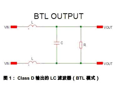 圖1是一個典型的Class D 輸出濾波網(wǎng)絡(luò)(BTL 輸出模式)。LC 濾波器由L,C 和負(fù)載R 組成。