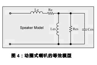 動圈式喇叭的阻抗特性可以使用圖4中的等效電路模型來模擬(等效電路模型的詳細(xì)分析請參見引用2)。其中: