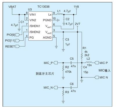 MOSFET,采用2MHz的開關(guān)頻率,轉(zhuǎn)換效率達到92%以上。高開關(guān)頻率和PWM/PFM自動切換技術(shù)可使工程師選擇低至2.2μH的表貼電感和陶瓷電容,即可滿足濾波和藍牙芯片對紋波的要求。TC1303內(nèi)集成的LDO可提供300mA的輸出電流,且只有137mV電壓差。為了進一步減小DC/DC開關(guān)噪聲對電路設計的影響,在芯片設計時將LDO的電源地引腳和DC/DC電源地引腳分開,保證了LDO輸出可以給I/O部分和麥克風提供“干凈”的電壓。