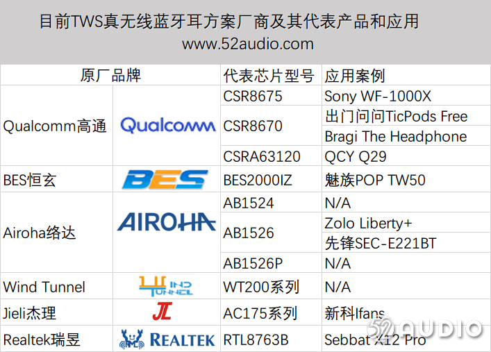 | 長時間深耕藍牙耳機領(lǐng)域,經(jīng)過大量的拆解和評測之后不完全統(tǒng)計,目前國內(nèi)制造藍牙耳機的廠商已有數(shù)百家,其中還有眾多與藍牙耳機產(chǎn)品相關(guān)的硬件等配套部件或技術(shù)方案的廠商活躍在一線陣地。直到我愛音頻網(wǎng)作此篇統(tǒng)計的時候,市場上目前呈現(xiàn)出“CBA”的格局,其分別為C(CSR高通)、B(BES恒玄)、A(Airoha絡(luò)達)。我愛音頻網(wǎng)對目前市面上常見的以及即將推出的TWS真無線藍牙耳機方案作了簡單統(tǒng)計,請查看下表。