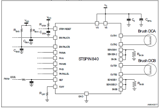 The STSPIN840 embeds two independent PWMcurrent controllers (one for each full bridge) basedon user settable values of reference voltage andOFF time.The devices can be forced in a low consumptionstate reducing the total current consumption downto less than 45uA.