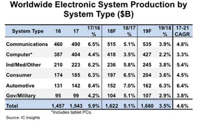 IC Insights市場分析師指出,今年汽車電子系統(tǒng)的銷售額預計將成長7%,達到1,520億美元,2019年將再成長6.3%,達到1,620億美元。該公司預計,從2017年到2021年,汽車電子系統(tǒng)銷售將以6.4%的復合年成長率(CAGR)成長,成長幅度超過其他的主要電子系統(tǒng)類別。