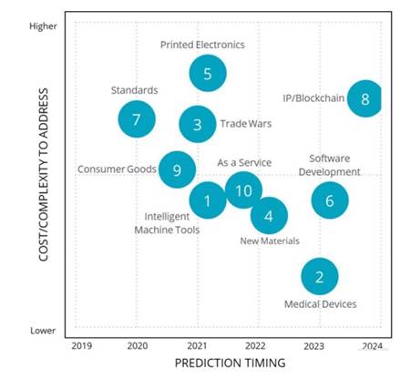 IDC 3D打印預(yù)測已根據(jù)不同主題進(jìn)行分類,如下圖所示; 預(yù)測也編號用于識(shí)別。