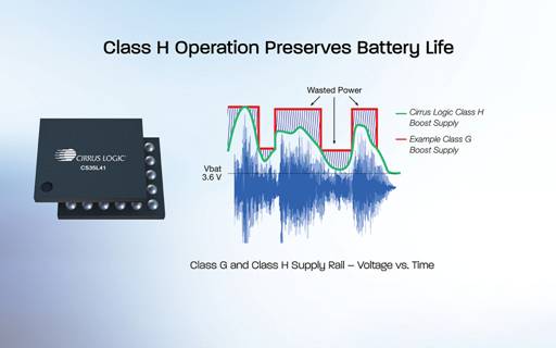 放大器性能——Cirrus Logic CS35L41的核心是一個(gè)5.3瓦數(shù)字輸入單聲道D類放大器,是同類產(chǎn)品中噪聲和功耗最低的器件。與其他智能放大器中常用的G類升壓電源相比,集成的H類11伏DC-DC升壓轉(zhuǎn)換器可提升電源電壓并保持更高的效率。通過(guò)自適應(yīng)跟蹤音頻電平,H類升壓轉(zhuǎn)換器有助于提高系統(tǒng)效率、最大限度地降低功耗并延長(zhǎng)電池壽命。