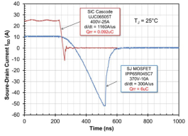 SiC共源共柵中的Si-MOSFET引入了一個(gè)體二極管,但是它屬于低電壓型,該二極管可以非?焖,因而具有低的反向恢復(fù)電流和損耗。圖4比較了650V額定值的UnitedSiC UJC06505T SiC共源共柵和650V的IPP65R045C7硅超級(jí)結(jié)MOSFET的恢復(fù)特性,顯示出大約60倍的回收電荷差異。