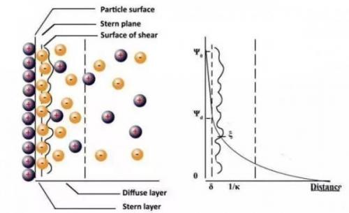 下圖為Stern雙電層模型,zeta電位(ξ,Zeta potential)為雙電層模型中極重要的參數(shù),實際測量時并無法直接測得粒子的表面電位,但可由聲波法或是電泳法計算出粒子的zeta電位。雙電層模型中Stern 層與擴散層間的剪切平面上存在zeta電位。