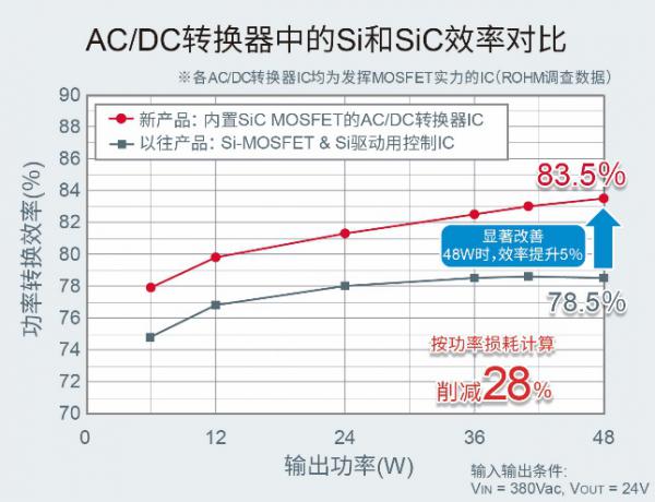 “BM2SCQ12xT-LBZ”是世界首款內(nèi)置節(jié)能性能極其優(yōu)異的SiC MOSFET的AC/DC轉(zhuǎn)換器IC,消除了分立結(jié)構(gòu)帶來的設(shè)計(jì)課題,從而可非常容易地開發(fā)出節(jié)能型AC/DC轉(zhuǎn)換器。專為工業(yè)設(shè)備的輔助電源*3)用而優(yōu)化的控制電路和SiC MOSFET一體化封裝,使得新產(chǎn)品與普通產(chǎn)品相比具有諸多優(yōu)勢(shì),部件數(shù)量顯著減少(將12種產(chǎn)品和散熱板縮減為1個(gè)產(chǎn)品),部件故障風(fēng)險(xiǎn)降低,引進(jìn)SiC MOSFET相應(yīng)的開發(fā)周期減少等,一舉解決了諸多課題。與ROHM以往產(chǎn)品相比,功率轉(zhuǎn)換效率提高達(dá)5%(按功率損耗計(jì)算,削減28%)。因此,本產(chǎn)品非常有助于工業(yè)設(shè)備實(shí)現(xiàn)顯著小型化、高可靠性和節(jié)能化。