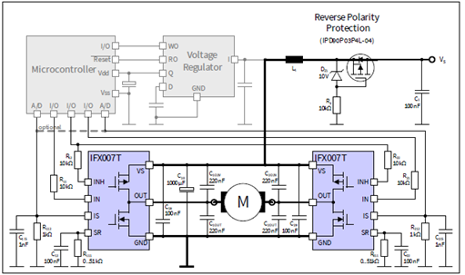 圖2. IFX007T應(yīng)用電路:兩個IFX007T組成H橋