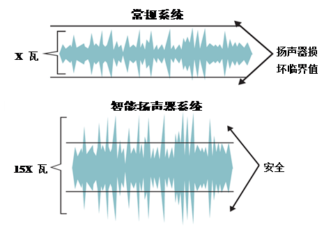 圖 3:揚(yáng)聲器保護(hù)算法使揚(yáng)聲器能夠輸出比傳統(tǒng)放大器高出兩倍的音量,同時(shí)不會(huì)損壞元器件