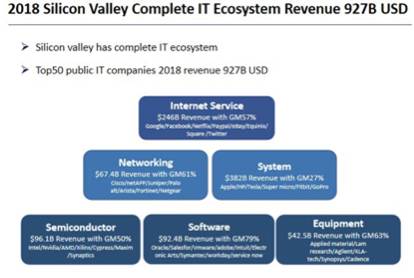 “芯片是互聯(lián)網(wǎng)的根基。芯片1元的產(chǎn)值可帶動相關(guān)電子信息產(chǎn)業(yè)10元的產(chǎn)值,帶來100元的GDP! 漢能投資董事總經(jīng)理陳少民分析認(rèn)為,“在過去60年當(dāng)中,硅谷的半導(dǎo)體公司衍生出一個生態(tài)圈,分類為六個產(chǎn)業(yè):底層的半導(dǎo)體、系統(tǒng)軟件、半導(dǎo)體設(shè)備及周邊,中層的網(wǎng)絡(luò)設(shè)備和系統(tǒng)整機(jī)公司,以及最上層的互聯(lián)網(wǎng)公司!