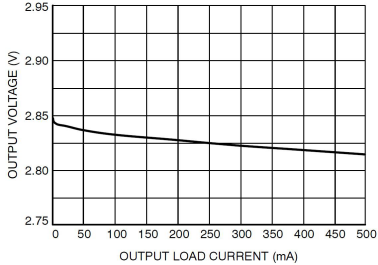 LDO的輸入電壓和輸出電壓的差值就是LDO的壓差。在一定的負(fù)載電流下,LDO以最小的輸入電壓維持正常的輸出電壓,此時輸入電壓與輸出電壓的差稱為最小壓差。LDO在不同的負(fù)載電流下有著不同的最小壓差。為了保證輸出電壓的穩(wěn)定,在實(shí)際應(yīng)用中需要根據(jù)負(fù)載電流的大小來判斷保證正常的輸出電壓所需的最小壓差。LDO的壓差決定了它的工作電壓范圍,低壓差的LDO則可以接受更低的工作電壓,應(yīng)用在輸入電壓更低的場合,并且降低了耗散功率,提高了效率。圖1是某LDO壓差特性曲線,該LDO標(biāo)稱輸出電壓為2.8V,從圖中可以看出,輸出電流為500mA時,輸入電壓至少要為3.2V以上才能維持正常的2.8V電壓輸出。