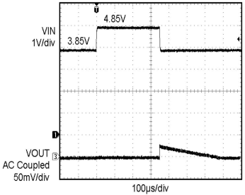在LDO應(yīng)用中,輸入電壓和輸出負(fù)載有時候會有劇烈的變化。LDO的輸入端可能會因?yàn)楣╇娫O(shè)備的電壓波動而造成LDO的輸入端電壓劇烈變化的情況。輸出端可能會出現(xiàn)輸出負(fù)載的切換,出現(xiàn)某部分負(fù)載啟動或停止等情況。這些情況都會造成LDO輸出電壓產(chǎn)生波動。我們可以通過LDO的瞬態(tài)響應(yīng)曲線來了解LDO在遇到輸入電壓或負(fù)載電流在劇烈變化時LDO輸出電壓的變化情況。具有良好瞬態(tài)響應(yīng)的LDO,在輸入電壓或負(fù)載電流在劇烈變化時,LDO的輸出電壓波動幅度小,恢復(fù)時間快。圖6為某LDO線性瞬態(tài)響應(yīng)曲線,當(dāng)輸入電壓波動1V時,輸出電壓也跟著波動約25mV,然后電壓逐漸恢復(fù)。圖7為某LDO負(fù)載電流突然從0.1mA切換為500mA時,輸出電壓瞬間會跌落約40mV然后有所恢復(fù)。