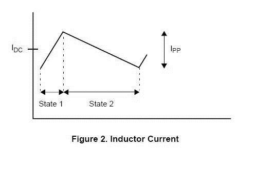 因此,當電感上的電壓為正時(狀態(tài)1),電感上的電流就會增加;當電感上的電壓為負時(狀態(tài)2),電感上的電流就會減小。通過電感的電流如圖2所示: