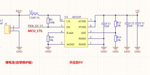 接下來(lái),我們就來(lái)看下升壓部分的電路,鋰電池升壓部分筆者采用了一顆型號(hào)為KF2185的同步升壓芯片,這款芯片的同步升壓效率最高可達(dá)94%,持續(xù)帶載能力可以達(dá)到2A以上,可調(diào)節(jié)電壓輸出,外圍電路也是很簡(jiǎn)單。