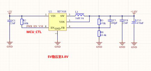 接下來(lái),就是3.8V的穩(wěn)壓芯片,筆者這里選用的也是一款可以電壓輸出的芯片KF7416,這款芯片的轉(zhuǎn)換效率也是最高可達(dá)到95%,外圍電路也是非常的簡(jiǎn)單,SOT23-6的封裝,也算是很節(jié)省空間了。