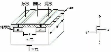在源區(qū)、漏區(qū)之間的襯底表面覆蓋一層二氧化硅(SiO2)絕緣層,在此絕緣層上沉積出金屬鋁層并引出電極作為柵極(用G表示)。從襯底引出一個歐姆接觸電極稱為襯底電極(用B表示)。