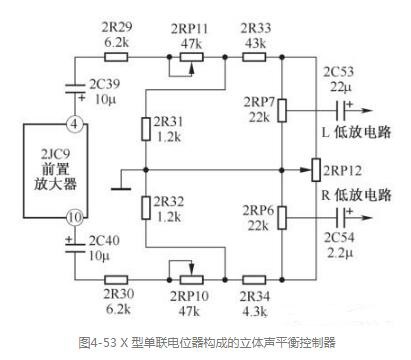 圖4-53所示是常用的X型單聯(lián)電位器構(gòu)成的立體聲平衡控制器,2RP12構(gòu)成立體聲平衡控制器電路,它接在左、右聲道放大器輸出端之間,為低放電路(音頻放大系統(tǒng)中的功率放大器)的輸入端。