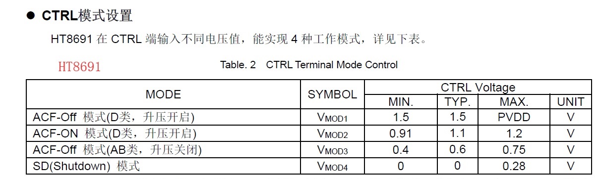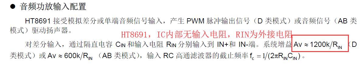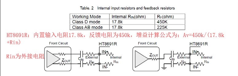 比如:都工作在防破音模式,HT8691是1.1V左右,HT8691R是2V左右。4. 放大倍數(shù)(增益)設(shè)置區(qū)別: