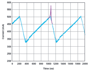 圖 3 顯示了通過與所用示波器兼容的電流探頭檢測到的開關(guān)電源的電感電流(藍色)的測量結(jié)果。除了顯示為藍色的測量結(jié)果之外,還添加了紫色標記,它指示當電感開始接近峰值電流進入過度飽和時,流過電感的電流狀況。當選擇的電感對于給定的應用不能提供足夠的額定電流時,就會發(fā)生這種情況。在開關(guān)電源中進行電感電流測量的主要原因之一是,它可以幫助識別是否正確選擇了電感,或者在工作中或故障情況下是否會出現(xiàn)電感飽和。