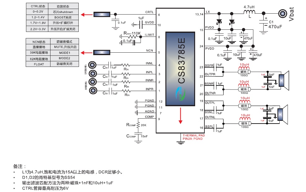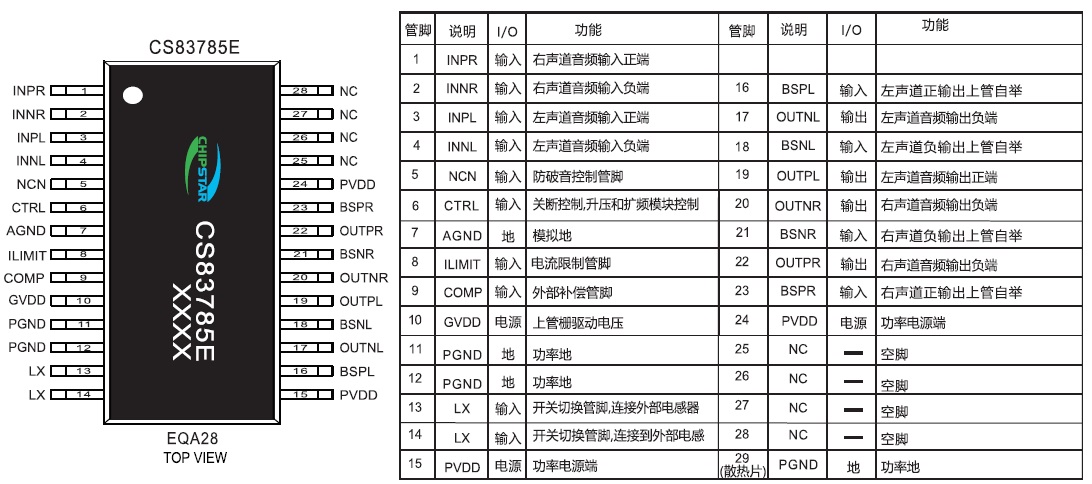 CS83785E是一款兼顧12V適配器供電應(yīng)用針對(duì)單節(jié)鋰電應(yīng)用 ,帶兩種防破音模式 ,擴(kuò)頻模塊 ,內(nèi)置BOOST升壓模塊,R類立體聲音頻功率放大器?梢詾4Ω 的負(fù)載提供最高 2X10W的恒定功率.CS83785E管腳完全兼容CS83711E,為音頻子系統(tǒng)的功放設(shè)計(jì)以及終端產(chǎn)品的升級(jí)更換提供了可觀的功率裕量以及最大的便利性。CS83785E的全差分架構(gòu) 和極高的PSRR有效地提高了CS83785E對(duì)RF噪聲的抑制能力。無(wú)需濾波器的PWM調(diào)制結(jié)構(gòu)及內(nèi)置的BOOST升壓模塊,以及CS83785E采用專有的AERC((Adaptive Edge Rate Control)技術(shù) ,在音頻全帶寬范圍內(nèi)極大地降低了EMI的干擾,對(duì)60cm的音頻線,在FCC的標(biāo)準(zhǔn)下具有超過(guò)20dB的裕量,另外CS83785E內(nèi)置了過(guò)流保護(hù),短路保護(hù)和過(guò)熱保 護(hù),有效的保護(hù)芯片在異常的工作條件下不被損壞。