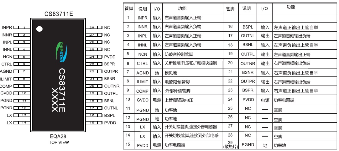 CS83711E的全差分架構(gòu)和極高的PSRR有效地提高了CS83711E對(duì)RF噪聲的抑制能力。無(wú)需濾波器的PWM調(diào)制結(jié)構(gòu)及內(nèi)置的BOOST升壓模塊,以及CS83711E采用專有的AERC(Adaptive Edge Rate Control)技術(shù) ,在音頻全帶寬范圍內(nèi)極大地降低了EMI的干擾,對(duì)60cm的音頻線,在FCC的標(biāo)準(zhǔn)下具有超過(guò)20dB的裕量,另外CS83711E內(nèi)置了過(guò)流保 護(hù),短路保護(hù)和過(guò)熱保護(hù),有效的保護(hù)芯片在異常的工作條件下不被損壞。