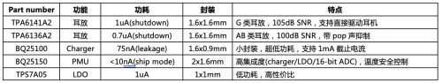 與充電盒的設(shè)計相比,耳機端的空間更小,對芯片的封裝和功耗提出了更嚴格的要求。針對這種情況,TI在耳機端的方案匯總?cè)缦拢?/font>