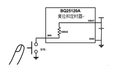 BQ25120A系列產(chǎn)品充電器的運(yùn)輸節(jié)電模式使用按鈕接口實(shí)現(xiàn),如圖2所示。按鈕輸入(/MR)在內(nèi)部上拉至VBAT管腳。當(dāng)器件處于運(yùn)輸節(jié)電模式且用戶按下/MR按鈕時(shí),產(chǎn)品將退出運(yùn)輸節(jié)電模式。