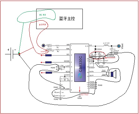電路板上所有的器件以及單元電路都是以地線(xiàn)作為參考電位。原理上地線(xiàn)作為零電位,器件之間不會(huì)產(chǎn)生由于地線(xiàn)的耦合干擾。但實(shí)際是不可能的,所有引線(xiàn)都具有阻抗,只要地線(xiàn)有電流流過(guò),就會(huì)產(chǎn)生相應(yīng)的壓降。電路走線(xiàn)還會(huì)形成電感,這意味著電流從電源正極流向負(fù)載,然后返回電源負(fù)極,在整個(gè)電流通道上存在一定的電感。工作在較高頻率時(shí),電感將增大地線(xiàn)阻抗,比如DC-DC升壓電路中電源-電感-MOS管-地通路。如果不分地,特別整個(gè)地平面不完整,音頻功放信號(hào)又是單端輸入的情況下,數(shù)字電路以及升壓電路的開(kāi)關(guān)噪聲就會(huì)通過(guò)地線(xiàn)耦合到音頻功放的輸入端或者電源端,最終喇叭輸出明顯的底噪聲。所以分地是一個(gè)處理底噪聲的好辦法。以?xún)?nèi)置升壓音頻功放CS8330用于藍(lán)牙音箱為例,可將整個(gè)PCB板地線(xiàn)分成三部分:DGND, PGND, AGND。DGND是主控?cái)?shù)字電路部分,包括藍(lán)牙射頻部分地線(xiàn)可跟數(shù)字地接一起。PGND主要是音頻功放DC-DC升壓部分以及功率放大部分,包括外圍的濾波電容。充電部分可在功放的前端接一起,也可單獨(dú)一部分。AGND包括藍(lán)牙主控芯片ADC, DAC,MIC部分模擬地以及音頻功放內(nèi)部輸入端預(yù)放部分模擬地。最終DGND,PGND,AGND三大塊在電池或者電源輸入端匯總一點(diǎn)接地。如下圖所示: