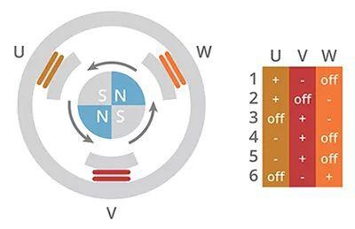 因?yàn)?BLDC 電機(jī)的轉(zhuǎn)子受旋轉(zhuǎn)的定子磁極影響,所以須追蹤定子磁極位置,以有效驅(qū)動(dòng)三個(gè)電機(jī)相。為此,需使用電機(jī)控制器在三個(gè)電機(jī)相上生成六步換向模式。這六步(或換向相)移動(dòng)電磁場,進(jìn)而使轉(zhuǎn)子永磁體移動(dòng)電機(jī)軸。
