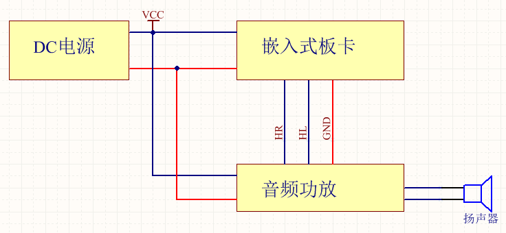 如下圖所示,嵌入式板卡與功放使用同一個電源,音頻信號由嵌入式板卡通過3.5MM接口輸出,給音頻功放。