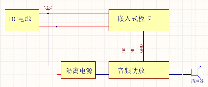 嵌入式板卡的供電由DC電源提供,音頻功放的電源由DC-DC隔離電源提供,這樣就切斷了功放與嵌入式板卡之前的地,行成不了環(huán)地,這樣這個環(huán)地噪聲也就沒有了。