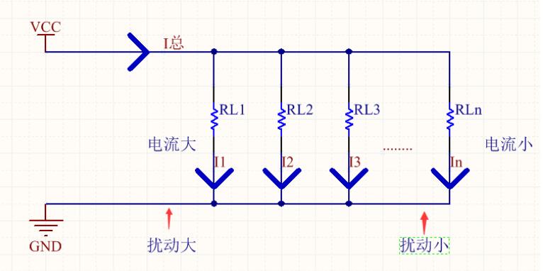 所以,要求嵌入式板卡的電源以及地需要設(shè)計合理,如上圖所示,電源輸入總電流為I總,分別流向負載,RL1、RL2….RLn,均會產(chǎn)生一個對應(yīng)的電流I1,I2……In。