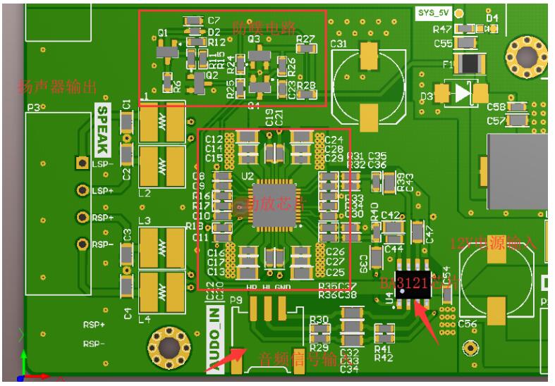 從絲印上來看,其電源采用了10W的12V轉(zhuǎn)12V隔離電源,音頻采用的是PAM8006方案,15Wx2雙聲道8歐姆揚聲器的D類數(shù)字功放。
