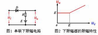 圖1所示的限幅電路中,因二極管是串在輸入、輸出之間,故稱它為串聯(lián)限幅電路。圖中,若二極管具有理想的開關(guān)特性,那么,當ui低于E時,D不導(dǎo)通,uO=E;當ui高于E以后,D導(dǎo)通,uO=ui。該限幅器的限幅特性如圖2所示,當輸入振幅大于E的正弦波時,輸出電壓波形見圖3。可見,該電路將輸出信號的下限電平限定在某一固定值E上,所以稱這種限幅器為下限幅器。如將圖中二極管極性對調(diào),則得到將輸出信號上限電平限定在某一數(shù)值上的上限幅器。
