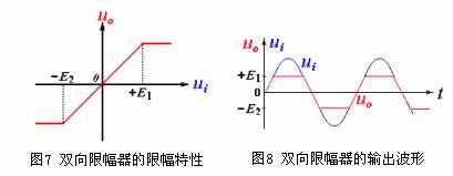 將上、下限幅器組合在一起,就組成了如圖6所示的雙向限幅電路,它的限幅特性如圖7所示。當輸入一個振幅較大的正弦信號時,輸出波形見圖8。 |