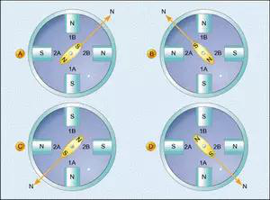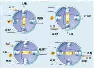 然后我們又切斷繞組1中的電流,按照圖2d所示方向給繞組2輸送電流,于是定子磁場又會指向右側,從而使得轉子旋轉,其南極也指向右側。