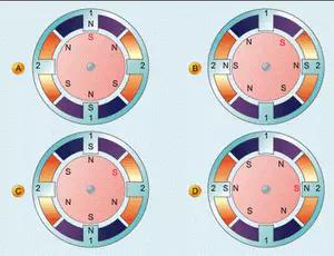 于是,轉子的一個距離最近的南極轉向了圖的左方,即轉子順時針轉動了30°。第三步,在圖3c中,我們又向繞組1施加一個電壓,在定子中產(chǎn)生一個北極指向圖下方的磁場,從而又使轉子順時針旋轉30°到達圖3c所示的位置。而在圖3d中,我們給繞組2施加電壓,在定子中產(chǎn)生一個北極指向定子右側的磁場,再一次使轉子順時針旋轉30°,到達圖3d所示的位置。