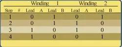 首先,要給腳1B和2B施加一個正電壓,并將1A和2A接地。然后,給腳1B和2A施加一個正電壓,而將1A和2B接地,這一過程其實取決于導線繞齒槽纏繞的方向,假設導線纏繞的方向與上一節(jié)所述相符。依次進行下去,我們就得到了表1中總結的激勵順序,其中,“1”表示正電壓,“0”表示接地。