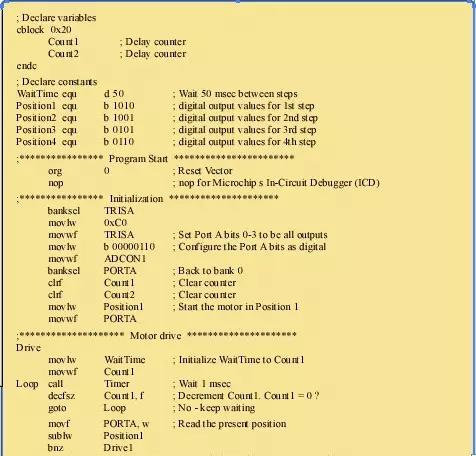 列表1給出了控制程序的匯編源代碼,該程序每50毫秒旋轉電機一次。首先,程序會將微控制器的數(shù)字輸出初始化為表4中第一步的值,然后每隔50毫秒(此時間常數(shù)由程序中的常量waitTime定義)按照正確的順序循環(huán)輸出數(shù)字信號。若需使電機反向旋轉,只需按與表4所示相反的順序輸出數(shù)字信號即可。