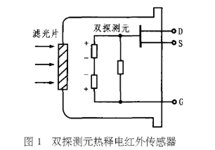 圖1是一個(gè)雙探測(cè)元熱釋電紅外傳感器的結(jié)構(gòu)示意圖。使用時(shí)D端接電源正極,G端接電源負(fù)極,S端為信號(hào)輸出。該傳感器將兩個(gè)極性相反、特性一致的探測(cè)元串接在一起,目的是消除因環(huán)境和自身變化引起的干擾。它利用兩個(gè)極性相反、大小相等的干擾信號(hào)在內(nèi)部相互抵消的原理來使傳感器得到補(bǔ)償。對(duì)于輻射至傳感器的紅外輻射,熱釋電傳感器通過安裝在傳感器前面的菲涅爾透鏡將其聚焦后加至兩個(gè)探測(cè)元上,從而使傳感器輸出電壓信號(hào)。