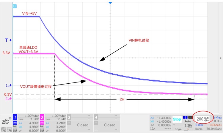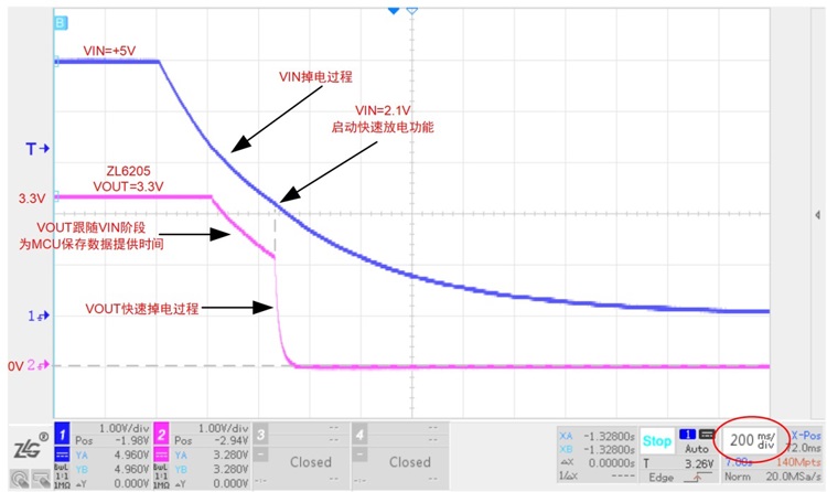 現(xiàn)在使用引腳封裝兼容的ZL6205直接替換上面圖1的普通LDO,然后在相同的電源下進行掉電測試。圖4實測相同的電路下ZL6205的掉電過程。其中藍色線(通道1)為掉電時輸入的電壓波形,粉色線(通道2)為掉電時輸出電壓波形。