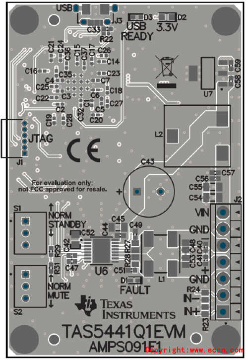 圖7. 評估板TAS5441-Q1 EVM PCB設計:正面