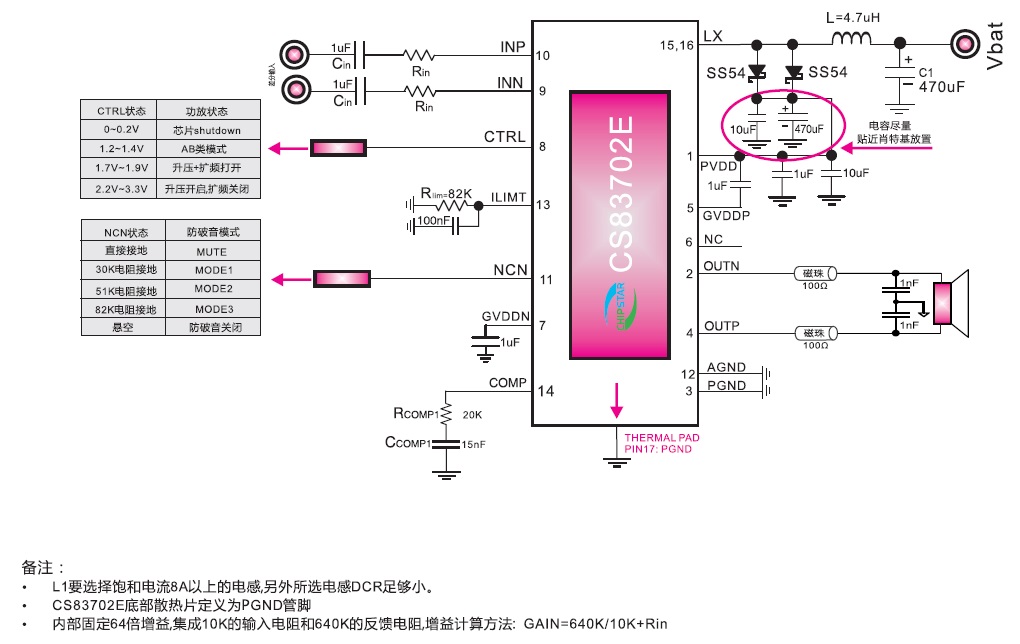 CS83702E的全差分架構(gòu)和極高的PSRR有效地提高對(duì)RF噪聲的抑制能力。無需濾波器的PWM調(diào)制結(jié)構(gòu)及內(nèi)置的BOOST升壓模塊 ,以及CS83702E采用專有的AERC((Adaptive Edge Rate Control)技術(shù),在音頻全帶寬范圍內(nèi)極大地降低了EMI的干擾,對(duì)60cm的音頻線 ,在FCC的標(biāo)準(zhǔn)下具有超過20dB的裕量,另外CS83702E內(nèi)置了過流保護(hù),短路保護(hù)和過熱 保護(hù),有效的保護(hù)芯片在異常的工作條件下不被損壞。