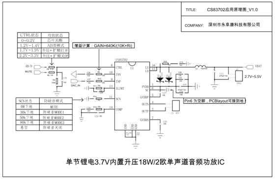 CS83702工作電壓范圍是2.7V~5.5V,采用EAQ16封裝,尺寸大小與ESOP-8一致;針對不同的應(yīng)用場合、不同的喇叭腔體需求、CS83702內(nèi)置三種防破音模式可選,靈活方便;另外擴(kuò)頻工作模式在整機(jī)EMI認(rèn)證測試時變得很輕松;AB/D類切換免除收音干擾;CS83702除了性能指標(biāo)優(yōu)秀、音質(zhì)表現(xiàn)突出、應(yīng)用簡單靈活之外,還有著完善的保護(hù)機(jī)制,包括過流保護(hù)、過熱保護(hù)、輸出短路保護(hù)等,實測輸出正負(fù)兩端短路、輸出對地短路、輸出對電源短路保護(hù)功能準(zhǔn)確無誤。