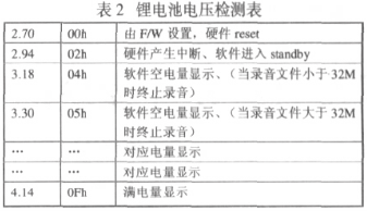 在 ATJ2085 中,電池電壓從電池電壓檢測引腳 VBATPIN 輸入,VBAT 的電壓范圍小于 3.0 伏,所以無論一節(jié)堿性電池(1.5V)供電還是兩節(jié)堿性電池(3.0V)供電,在外部電池供電電壓小于 3.0 伏時外部都無需要加分壓電阻。ATJ2085 中有一個 4bit 的 ADC,它把 0.9-1.5 伏之間的電壓 16 等分為:0.90V,0.94V,0.98V,1.02V,1.06V,1.10V,1.14V,1.18V,1.22V,1.26V,1.30V,1.34V,1.38V,1.42V,1.46V,1.50V。當(dāng)電池電壓大于 3.0 伏供電時,BATSEL 接高電平,決定了從 VBATPIN 腳輸入的電壓在比較前會被分壓。并且 A/D 變換出來的數(shù)值會每 2 秒一次被記錄在 IO PORT(D8H).BIT[3:0]里,這樣軟件就可以讀回 IO PORT(D8H)中的值,與功能規(guī)格表(表 1)中的值作比較,來確定要顯示的電池電量及采取的動作。很明顯 ATJ2085 能在更多點(diǎn)上監(jiān)測電池電壓。