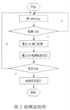 首先清 watchdog,然后通過 GPIO_A0 檢測 USB 狀態(tài),接下來進(jìn)行充電引腳 GPIO 確認(rèn)并開始充電,充電時將 GPIO_A0(如檢測電路圖)寄存器的對應(yīng)位置高電平,同時利用 GPIO_B6 進(jìn)行電池狀態(tài)檢測[6][7]。當(dāng)需要對 4 位 ADC 寄存器讀寫數(shù)據(jù)時,需要設(shè)置其端口值參數(shù),通過電池狀態(tài)檢測后,最后將檢測到的電池參數(shù)通過顯示函數(shù)顯示在 LCD 上。