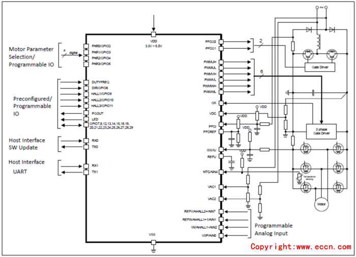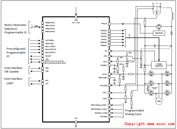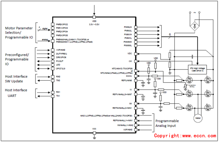 • Flexible host interface options for motor control commands: UART, PWM or analog input signal